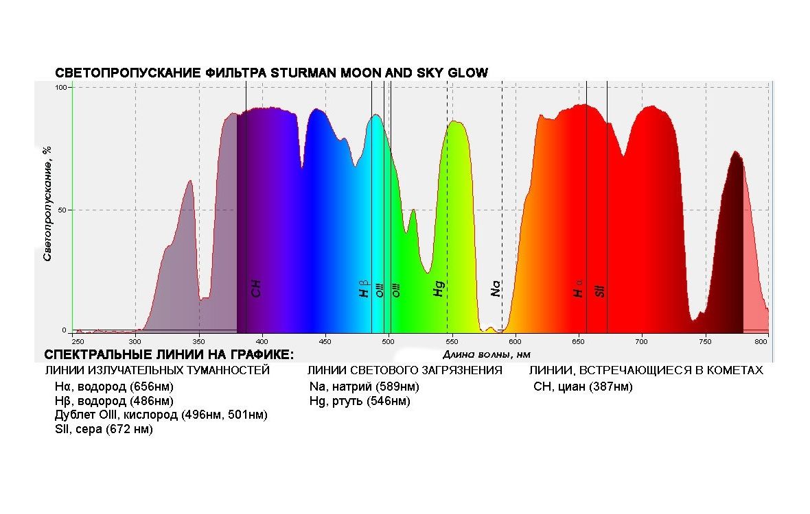 С использованием фильтра Sturman Moon and sky glow 1,25" удобно вести визуальные и фотографические наблюдения за Луной, планетами Солнечной системы, кометами и неяркими дип-скай объектами типа туманностей. Повышаются контрастность и детализация планетных дисков.Фильтр отсекает паразитное свечение атмосферы и городскую засветку, блокируя область спектра от 500 до 600 нм, характерную для электрофонарей. При использовании с телескопами-рефракторами уменьшается влияние хроматических аберраций на качество картинки, поскольку фильтруется область спектра с длиной волны менее 375 нм.