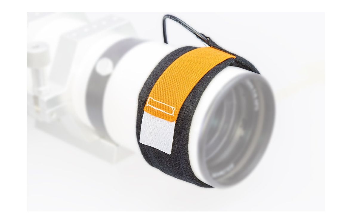 Обернув противоросник-обогреватель Sturman 200 мм вокруг объектива / бленды телескопа, закрепите положение фиксатором на липучке.