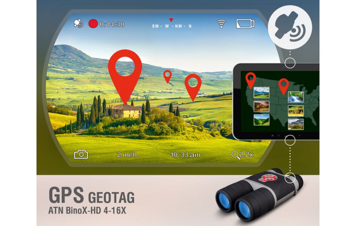 Функция «гео-тег» (geo-tag) позволяет снимки сделанные с помощью бинокля ATN BinoX-HD “привязывать” к местности по координатам GPS. Таким образом, впоследствии, не составит труда установить, в каком месте был сделан снимок, и восстановить весь маршрут путешествия. Отметки снимков так же содержат информацию о высоте местности с помощью встроенного датчика-альтиметра.