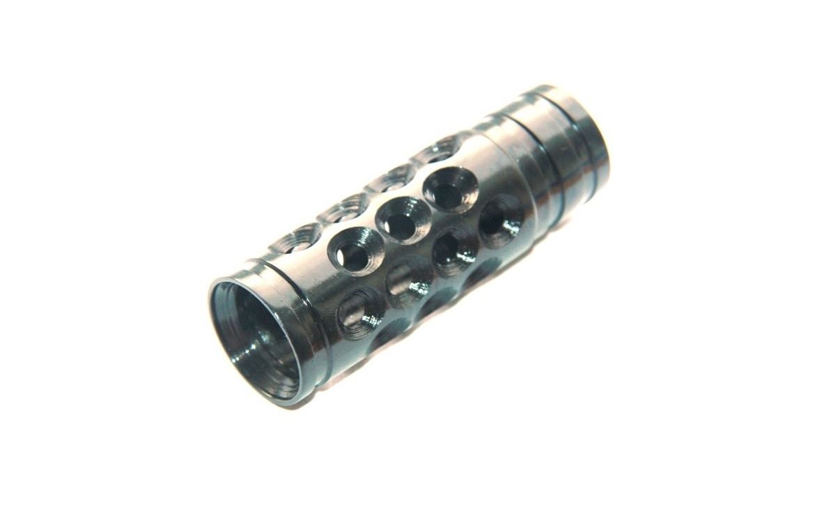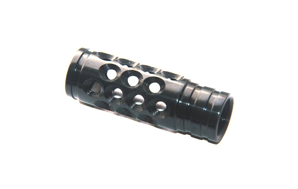 Пламегаситель с элементами ДТК (дульный тормоз-компенсатор) для Сайга-20 исп.001 (Тактика-Тула) представляет собой навесное приспособление, предназначенное для установки на ствол карабинов «Сайга» 20 калибра – к ним относятся различные модификации «Сайга-20», «Сайга-20К», «Сайга-20С» и т.д. За счет правильно просчитанных размеров и расположения отверстий камера-дожигатель практически полностью дожигает пороховые газы, лишь минимально «выпуская» их в виде слабой вспышки. Благодаря эффективному подавлению дульного пламени обеспечивается маскировка выстрела, и уменьшается опасность кратковременного ослепления стрелка.