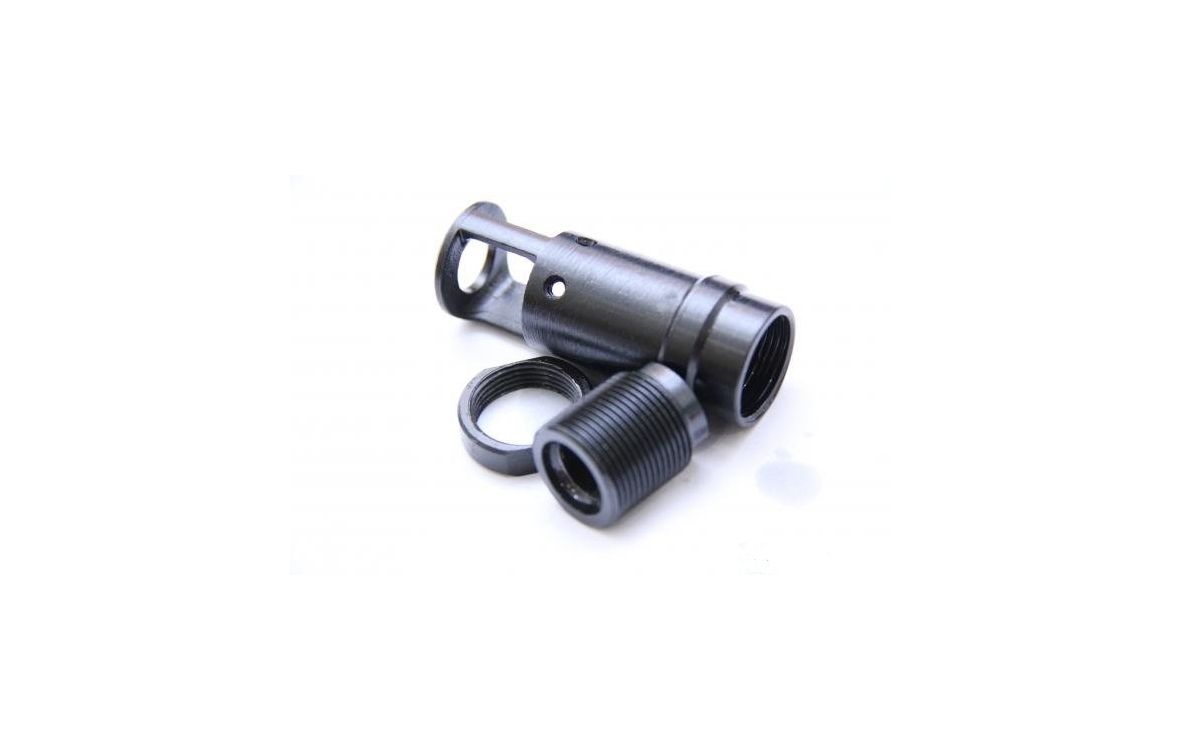 Пламегаситель Сайга410-004 изготовлен под патрон .410х76 мм и устанавливается на различные модификации карабина «Сайга 410» - Сайга 410, Сайга-410С, Сайга-410К различного исполнения. Для крепления на карабин применяется специальный переходник (есть в комплекте), имеющий с одной стороны резьбу 15х0,75 L (для Сайга-410), а с другой - М24х1,5 (АК). Фиксация выполняется при помощи контровочной гайки. Для установки не потребуется переделка оружия или дополнительные приспособления. Кроме того, резьба на стволе карабина будет надежно защищена от внешних повреждений.