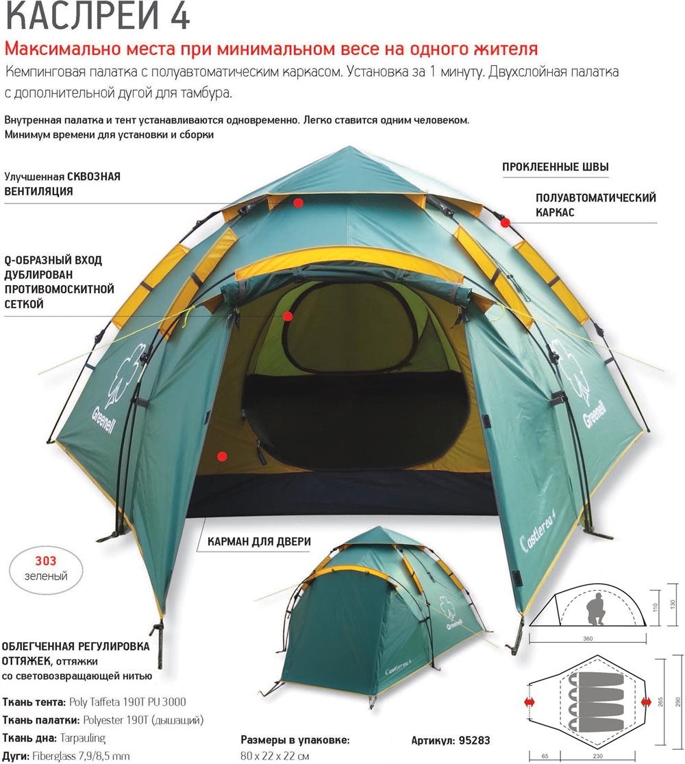 Кемпинговая палатка с полуавтоматическим каркасом. Низкая, всего 120 см в высоту, палатка, которая ставится очень быстро, порядка не больше минуты. Имеет большой, просторный тамбур, в котором можно разместить кое – какие необходимые вещи. Q - образный вход дублируется москитной сеткой и тем не менее с легкостью открывается одной рукой. Проклеенные швы обеспечивают надежность и долговечность палатки. Улучшенная сквозная вентиляция всегда обеспечит достаточный комфорт внутри. Палатка обеспечена оттяжками со светоотражающей нити, которые облегчают обнаружение их в сумерках. Данный вариант палатки отлично подойдет для отдыха большой компании в походах, на озере, в путешествиях.
