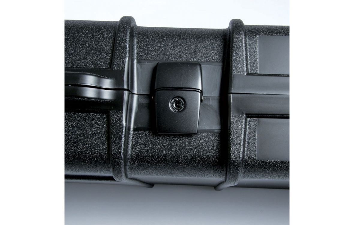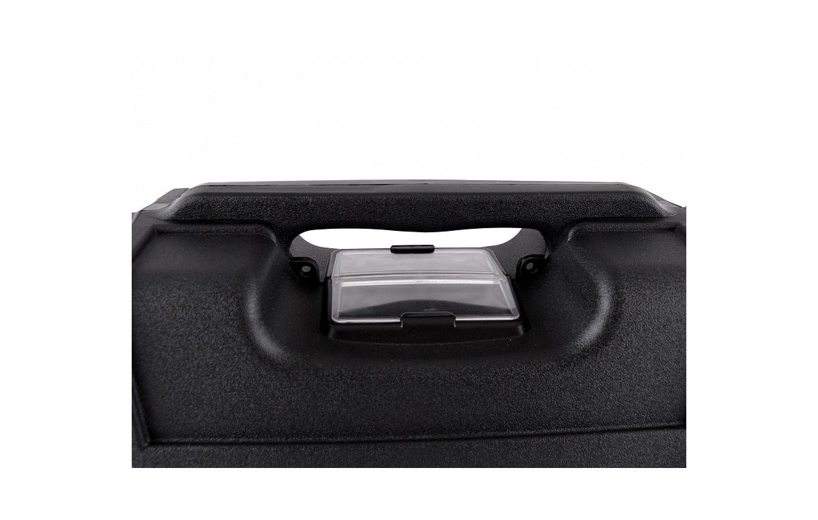 Изготовлен из пластика. Внутри наполнитель – серый волнистый поролон для более универсального использования кейса. Имеет 4 замка, которые можно дополнительно закрыть на ключ.