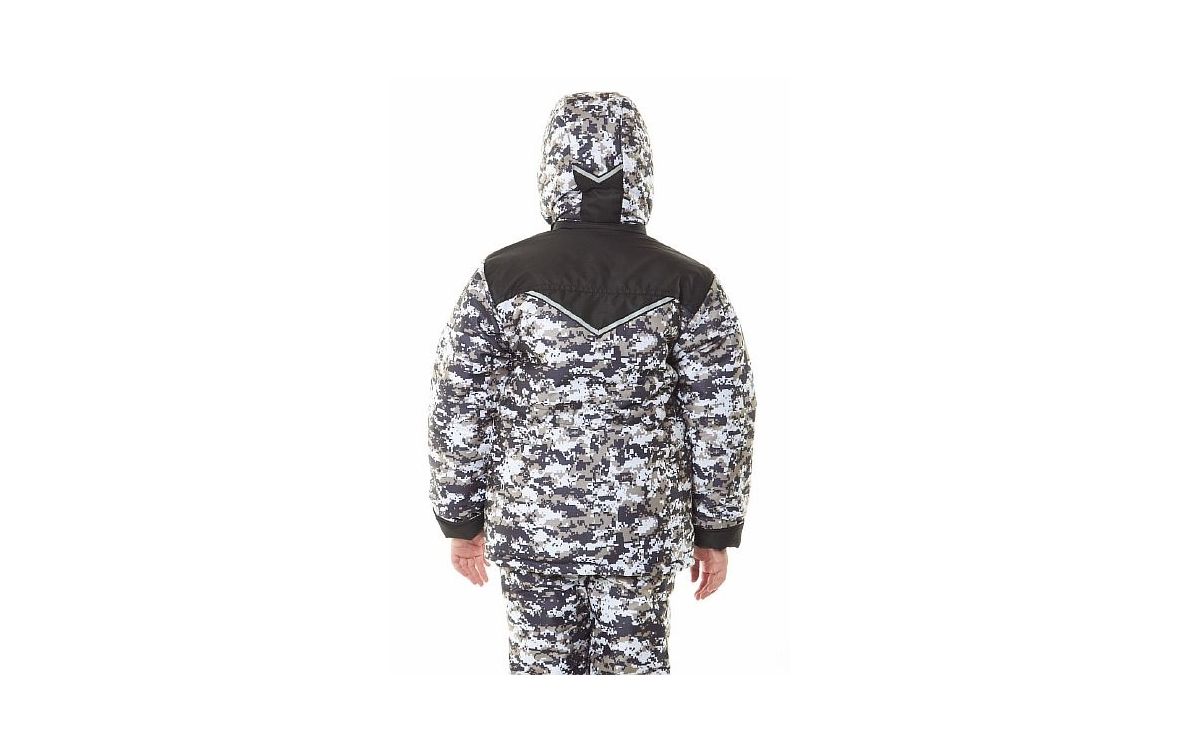 Куртка прямого силуэта с воротником стойкой, с центральной бортовой застёжкой на молнию, с ветрозащитным клапаном, застёгивающимся на текстильную застёжку «контакт». Куртка со съемным утеплённым капюшоном, стягивающийся шнуром по лицевому срезу, с кулисой по линии талии. На полочках обработаны два кармана в листочку и два нижних накладных кармана с клапанами, застёгивающимися на текстильную застёжку «контакт». На верхних и нижних клапанах расположены язычки. Спинка с отрезной кокеткой. Рукава втачные цельнокроёные, на подкладке с трикотажным напульсником и отделочным манжетом. На подкладке полочки обработаны накладные карманы из основной ткани, застёгивающиеся на текстильную тесьму «контакт».