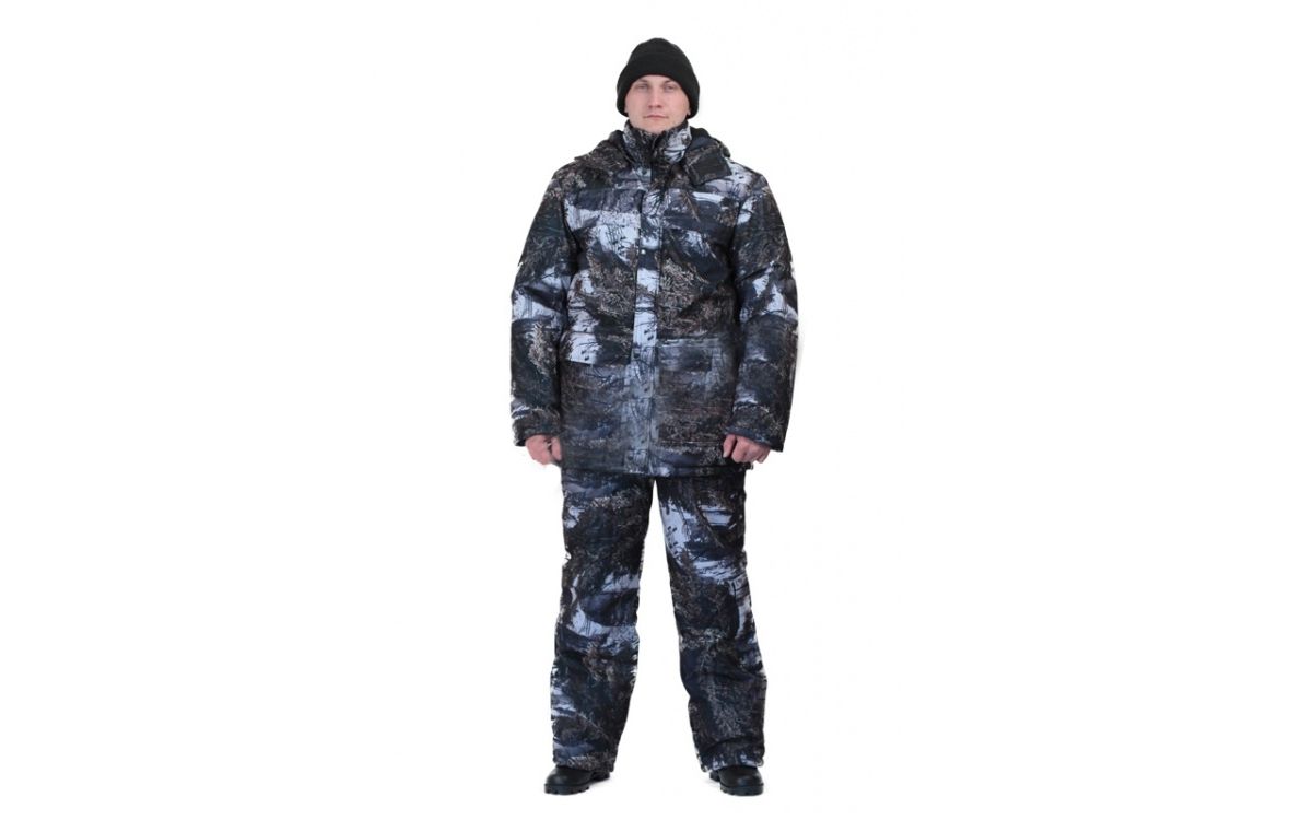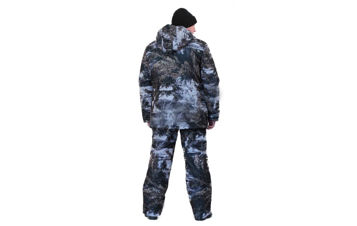 Камуфлированный универсальный костюм для охоты, рыбалки и активного отдыха при низких температурах. Состоит из удлиненной куртки и полукомбинезона.