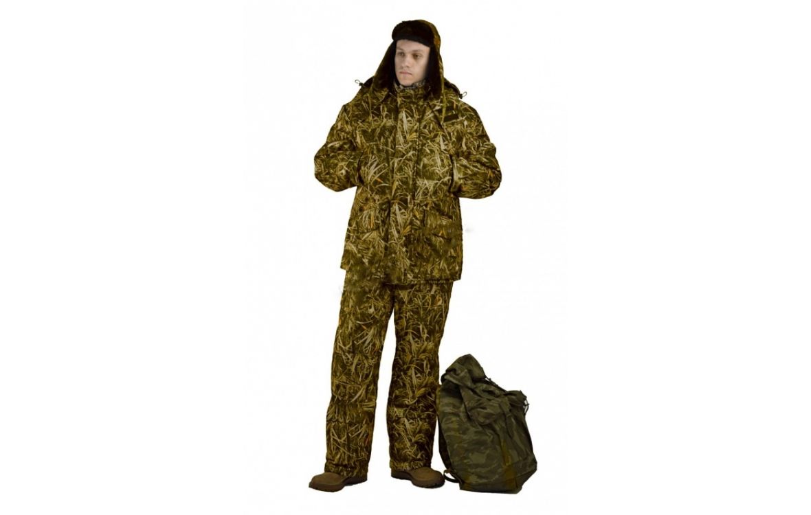Камуфлированный универсальный костюм для охоты, рыбалки и активного отдыха при низких температурах. Не шуршит. Состоит из удлинненной куртки с капюшоном и полукомбинезона.