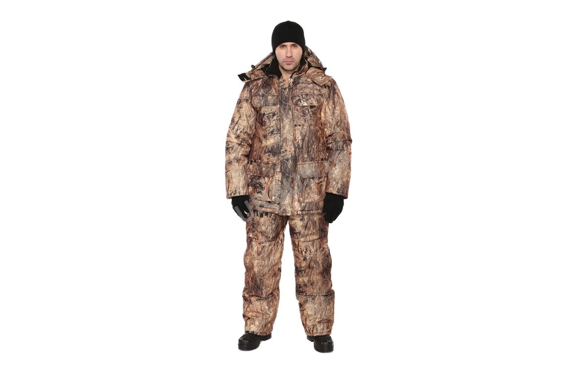 Камуфлированный универсальный костюм для охоты, рыбалки и активного отдыха при низких температурах. Не шуршит. Состоит из удлинненной куртки с капюшоном и полукомбинезона.