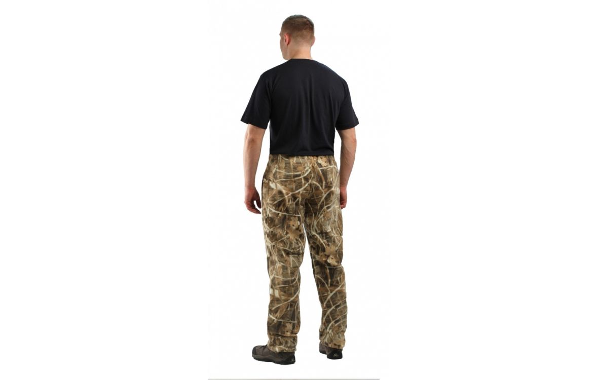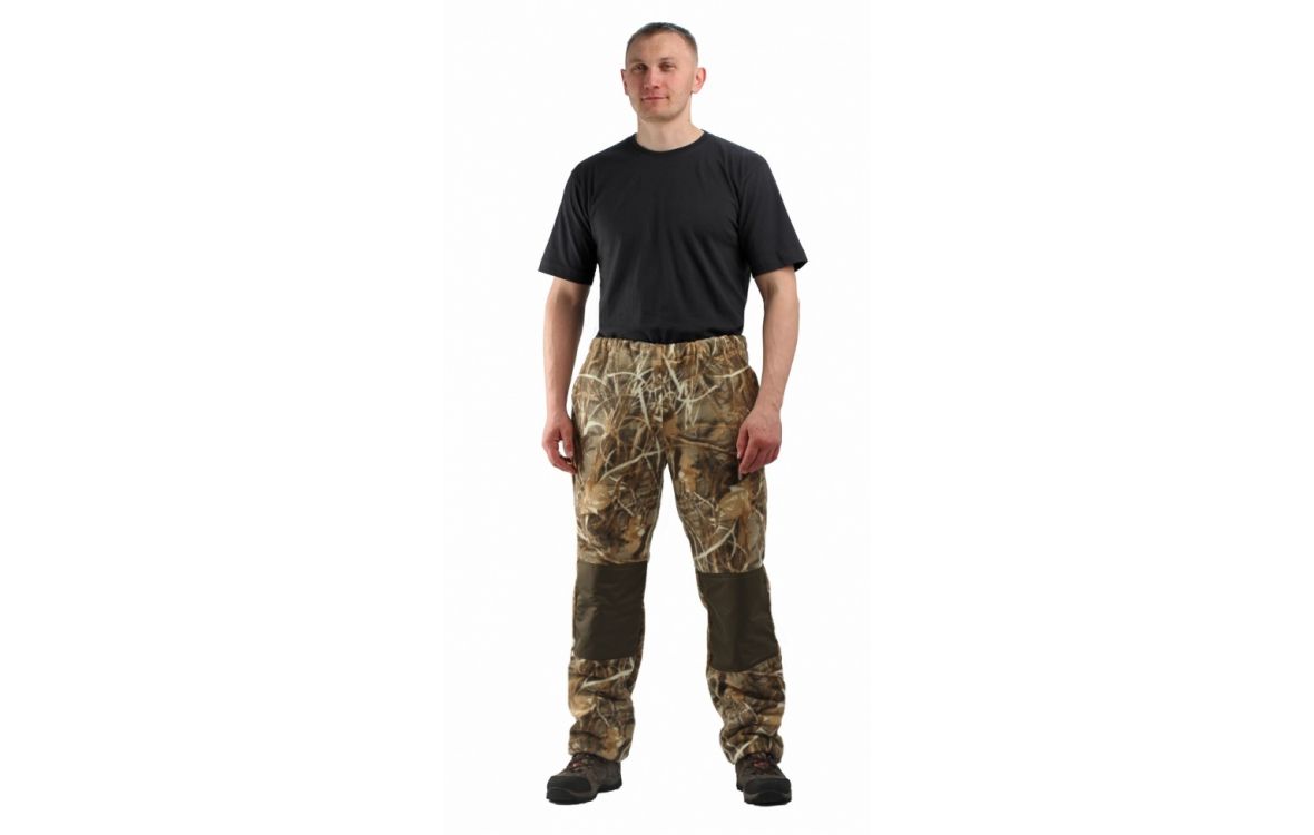 Верхний срез брюк с цельновыкроенным поясом, в пояс вставлена тканево-резиновая тесьма, простроченная посередине. Наколенники из отделочной ткани.