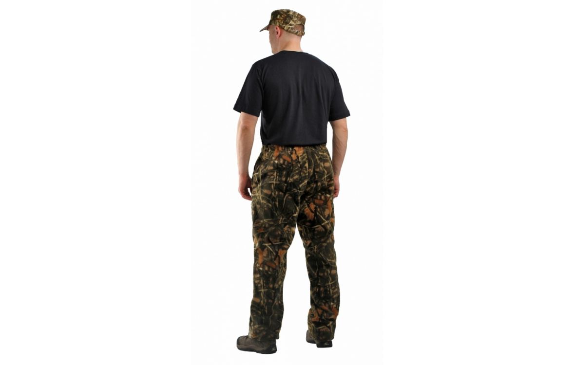 Верхний срез брюк с цельновыкроенным поясом, в пояс вставлена тканево-резиновая тесьма, простроченная посередине. Наколенники из отделочной ткани.