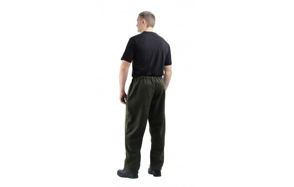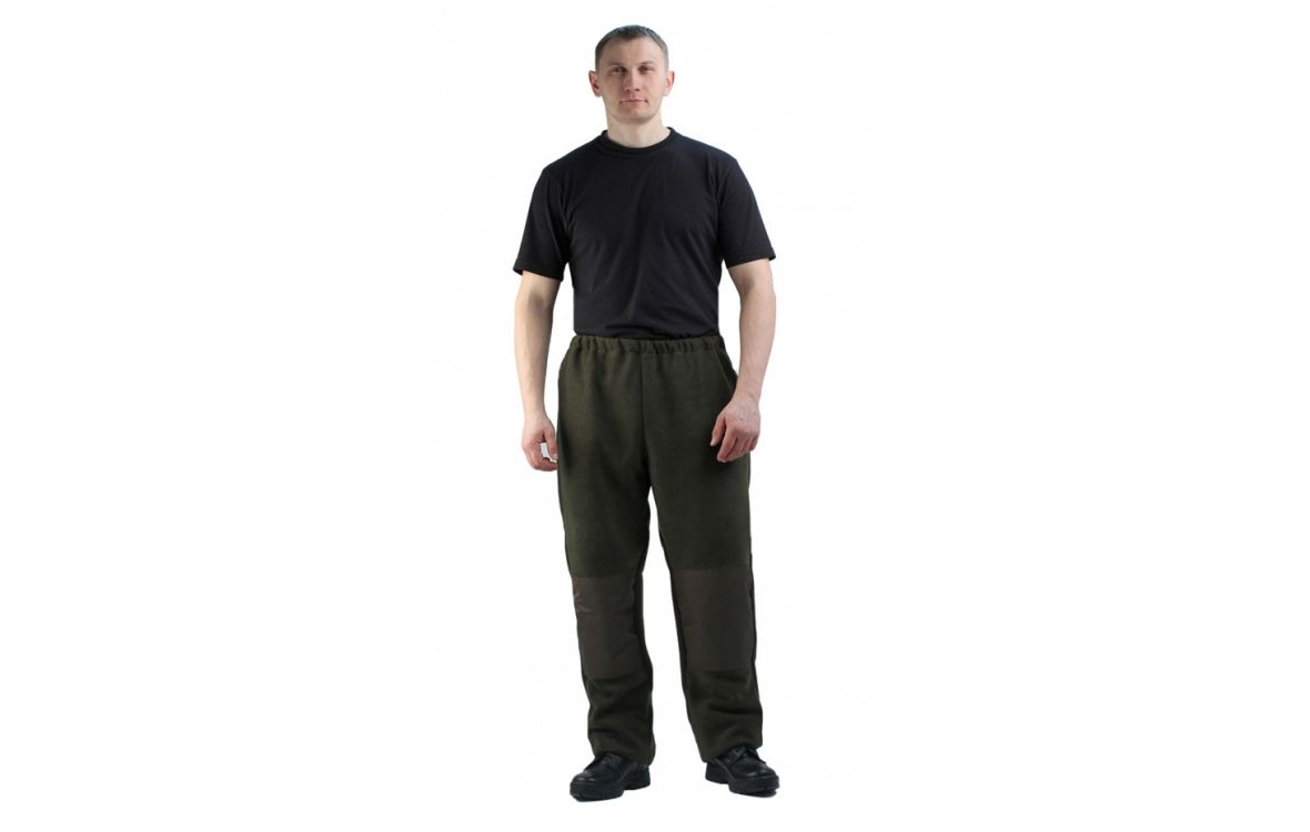 Верхний срез брюк с цельновыкроенным поясом, в пояс вставлена тканево-резиновая тесьма, простроченная посередине. Наколенники из отделочной ткани.