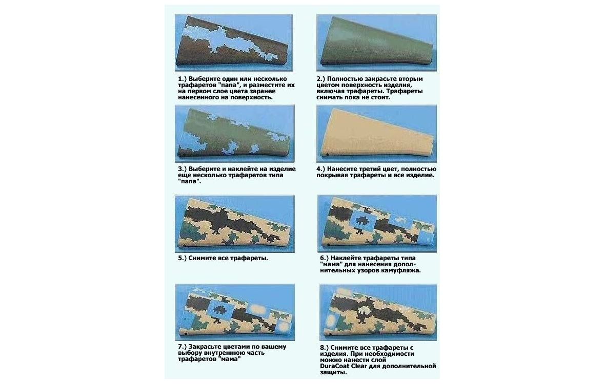 Трафареты для нанесения камуфляжа DuraCoat на оружие (пистолеты и винтовки), ножи, и другие предметы. При аккуратном использовании трафарет может быть применен до 4-6 раз.