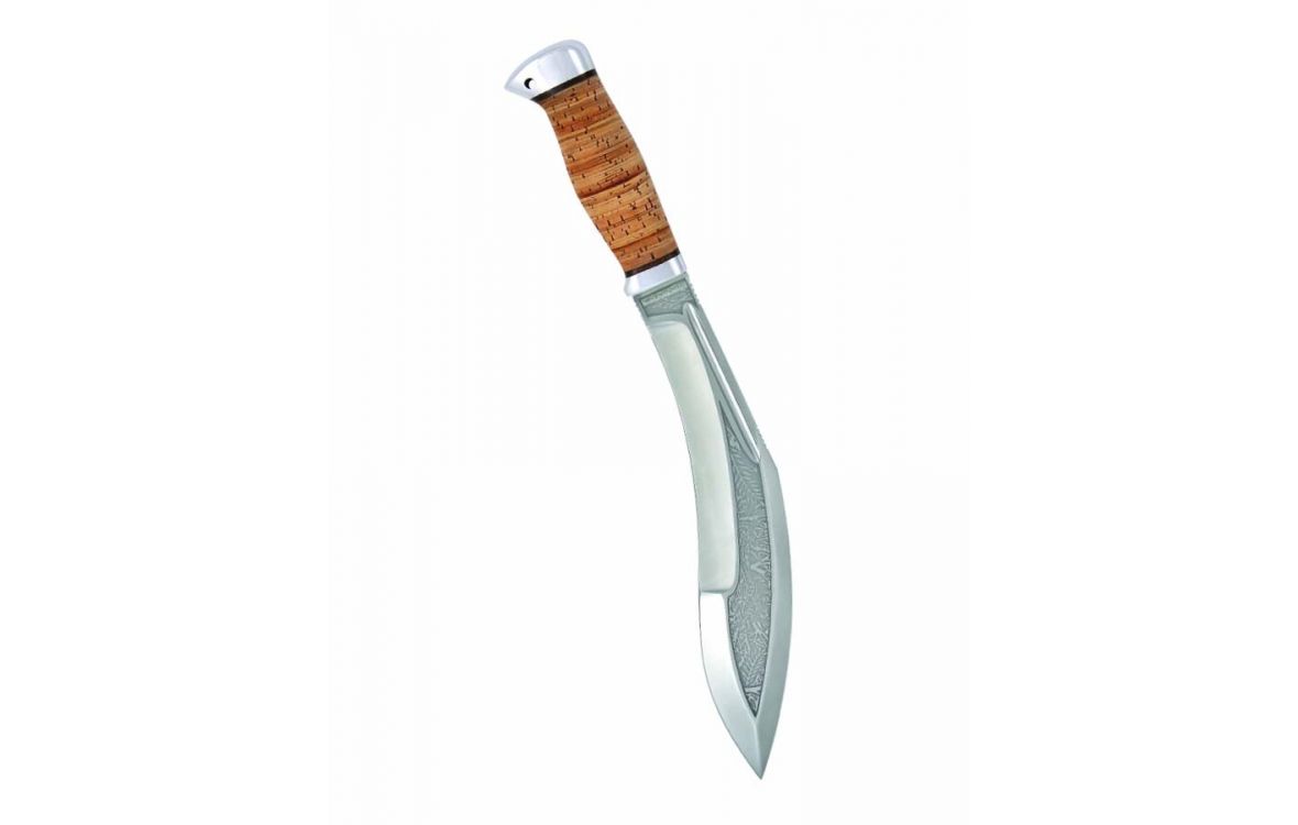 Традиционной для кукри формы изогнутый клинок, заточенный по внутренней стороне. Внушительный нож с огромным клинком переменной ширины, с толщиной обуха 6 мм. Жесткость клинка в узкой первой половине дополнительно усилена двумя долами. На обухе клинка от середины до острия клинка выведено фальшлезвие, что облегчает тяжелую широкую часть ближе. Это же фальшлезвие хорошо колет кости при разделке туши. Клинок имеет переменный угол заточки. Более острый угол обратнолинзовидных спусков первых двух третей клинка позволяет не только рубить, но и резать. Ближней к острию третью клинка, имеющей больший угол почти прямых спусков, можно рубить как топором. Центр тяжести клинка смещен ближе к острию клинка за счет его переменной ширины, что способствует эффективным рубящим ударам. Рукоять большая, удобной для рубки формы, имеет на расширяющемся навершии отверстие для темляка. Кукри, как и катана имеет уникальную конструкцию, обеспечивающую его выдающиеся свойства, дошедшие до нашего времени с XIV-XV веков почти без изменений. Кукри входил в комплект вооружения непобедимых Гуркхов и использовался в ближнем бою, а также заменял мачете, саперную лопатку, тесак и т.д. Нож-кукри просится в багажник машины при дальних путешествиях по бездорожью.