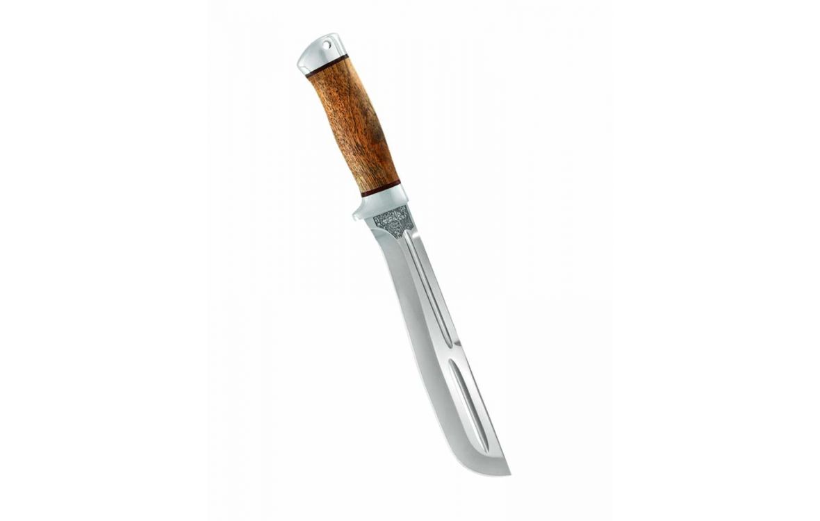 Внушительный нож с огромным клинком переменной ширины, с толщиной обуха 6 мм. Жесткость клинка дополнительно усилена четырьмя долами. На обухе клинка от середины до пяты клинка выведено фальшлезвие, что переносит центр тяжести еще ближе к острию ножа для эффективности рубящих ударов. Это же фальшлезвие хорошо рубит кости при разделке туши. Рукоять большая, удобной для рубки формы, имеет на навершии отверстие для темляка. Этот нож рекомендуется брать в багажник автомобиля вместо топорика при выездах на природу, ему нет равных при необходимости нарубить веток под колеса застрявшей машины и при обустройстве стоянки.