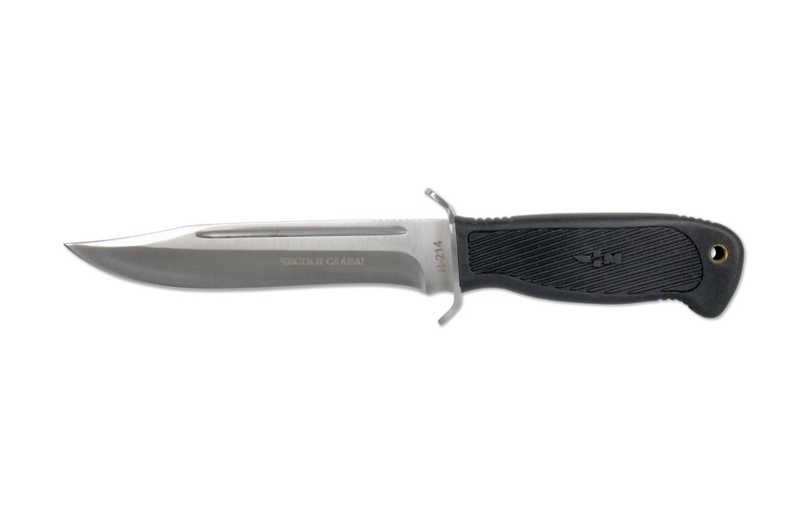 Нож H-214 "Ножемир" — острый инструмент с нескладным лезвием, без которого не обойтись на рыбалке, охоте или во время туристического похода. Инструмент изготовлен из нержавеющей стали марки 65х13, обладающей твердостью 55-56 HRC. Такой клинок отлично подходит для резки таких твердых материалов, как дерево и пластик, сохраняя отличную заточку. Рукоять выполнена из эластрона, что позволяет изделию надежно «сидеть» в руке. Дополнительно рукоять имеет рифленые накладки, обеспечивающие надежное сцепление с ладонью, что гарантирует идеальное выполнение любых манипуляций. Особое значение имеет объемная гарда, обеспечивающая защиту пальцев от порезов. Сквозное отверстие на рукояти позволяет носить нож на ремне, что особенно удобно во время охоты.