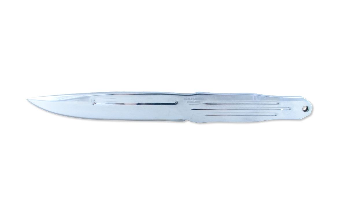- Упрощенная рукоять, отсутствуют упоры на рукояти и гарда. Ибо такие ножи не используются для резки и нет нужды в удобном хвате, а также этим снижается вес рукояти и улучшается баллистика.