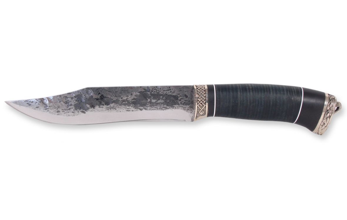 Нож КОМБАТ (8480)9хс - нож ручной ковки с клинком из стали 9ХС производится по специальному заказу и под контролем Компании ООО НОЖЕМИР в Нижегородской области. Клинок выкован и оттянут с помощью наклёпа, вручную. Нож не имеет стандартной заточки. Острота клинка обеспечивается за счет спусков, выведенных в ноль. Например, тем же способом заточена опасная бритва, хотя и у бритвы есть заточка. Сталь 9ХС — является инструментальной сталью, из которой выполняются метчики и сверла по металлу. Клинок ножа имеет толщину 4 мм и закалку до твердости 64 HRC. Рукоять ножа, выполненная из кожи и эбонита, украшена декоративными вставками и художественным литьём из мельхиора. Не рекомендуется рубить ножом с тонкой подводкой режущей кромки, потому что в виду тонкого острия, режущая кромка может крошиться. Такой нож создавался для легкого реза, отлично подойдёт для разделывания дичи. Однако сталь имеет склонность к окислению и требует ухода, как любой инструмент. Все ножи, продаваемые в магазине НОЖЕМИР - это хозяйственные или разделочные ножи. Каждый нож имеет соответствующий сертификат по ГОСТ Р 51644-2000 Ножи разделочные и шкуросъемные или ГОСТ Р 51501-99 Ножи туристические и специальные спортивные. Ножи ручной ковки это отличный выбор для охотников, туристов или просто любителей красивого и надежного оружия.