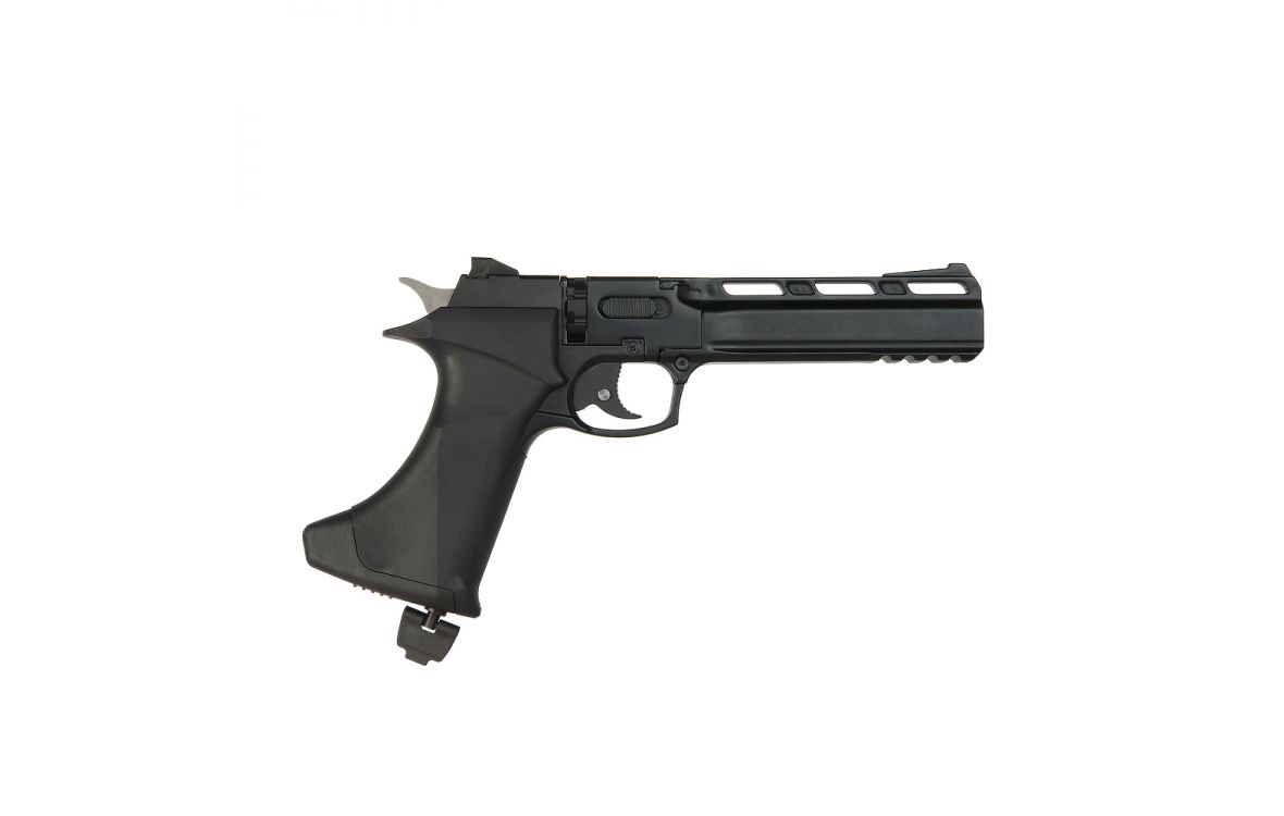 Газобаллонный пистолет (CO2), калибр 4,5 мм (.177), магазин барабанного типа на 8 пуль, длина нарезного ствола 170 мм, самовзводный УСМ, планка ласточкин хвост 11 мм, планка Weaver на 4 слота, вес 0,6 кг.