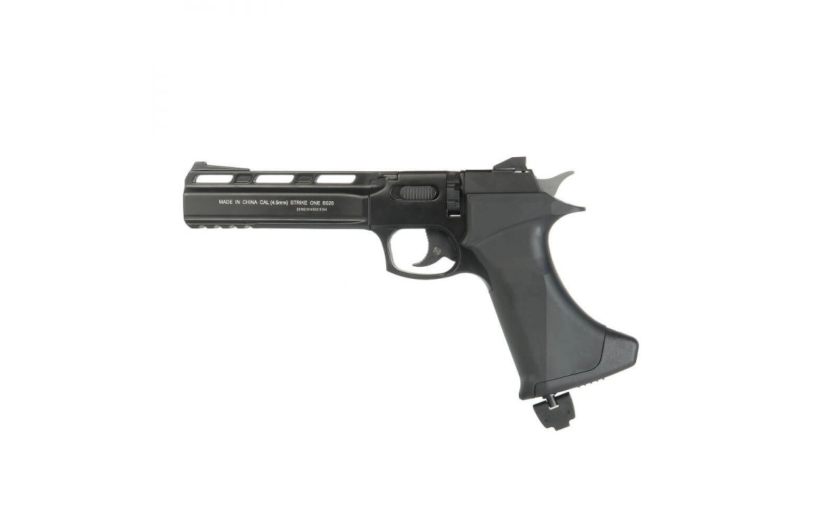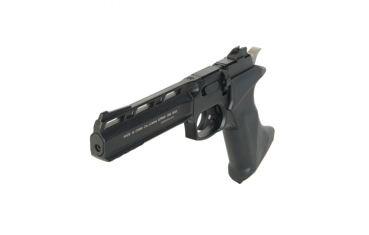 STRIKE ONE «В026» – газобаллонный пневматический пистолет револьверного типа с барабаном. Предназначен для любительской стрельбы в тире, а также за городом в местах, отвечающих всем нормам безопасности.