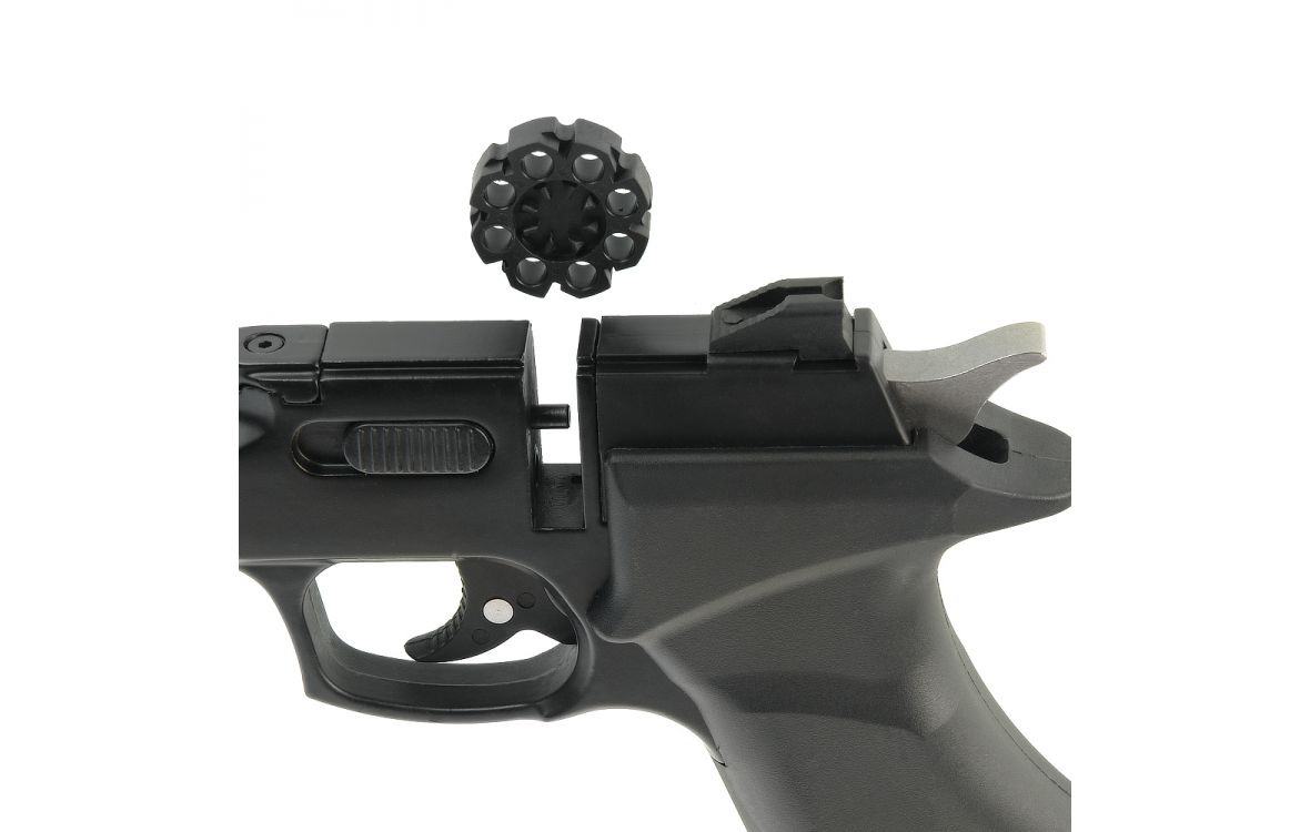 Барабан рассчитан на 8 пуль. Самовзводный ударно-спусковой механизм приводится в действие углекислым газом: используются баллоны СО2 на 12 г. Одного баллона хватает на 30 выстрелов. Гнездо для баллона находится в рукоятке.