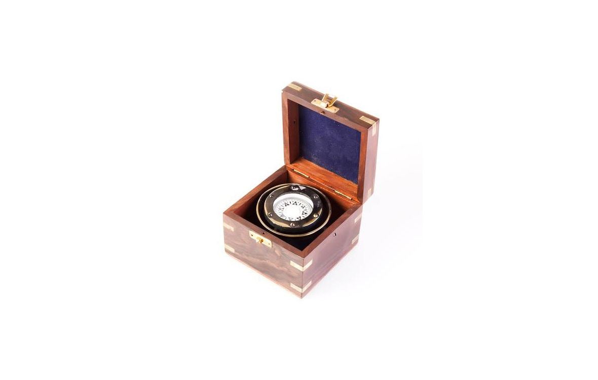 Выход есть! Никто не заподозрит, что внутри этой коробочки из красного дерева с медными фрагментами и обклеенной изнутри синим бархатом, находится настоящий морской компáс. Бронзовый, вывешенный на двух осях — он и при любой качке будет указывать Вам верное направление — строго на Север.