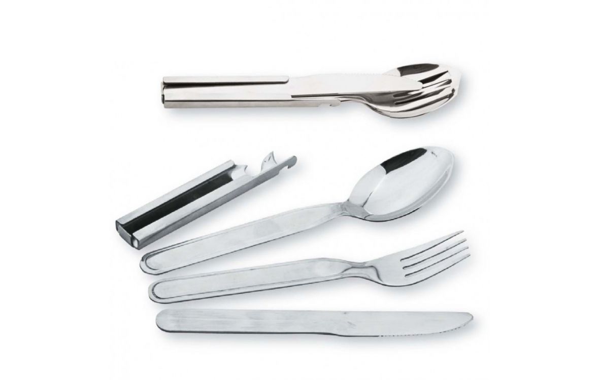 Легкий набор приборов S088 благодаря необычному дизайну все предметы можно скрепить вместе - ложка, вилка, нож, открывалка.