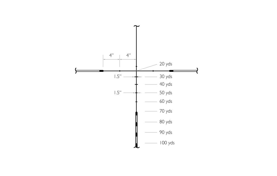 Прицел арбалетный Hawke Crossbow 1.5-5x32 (30mm Model) с баллистической сеткой MAP предназначен для стрельбы на дистанции от 10 до 100 ярдов (~ 100 метров). В качестве механизма, регулирующего кратность, используется реостат изменения скорости полёта стрелы в диапазоне 250 – 425 fps (76,2 – 130 м/с).