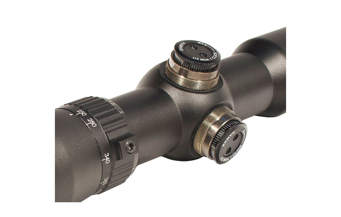 - Низкопрофильные пристрелочные барабанчики с чёткими кликами и возможностью сброса установок на «ноль», цена 1 деления - 1/4 MOA