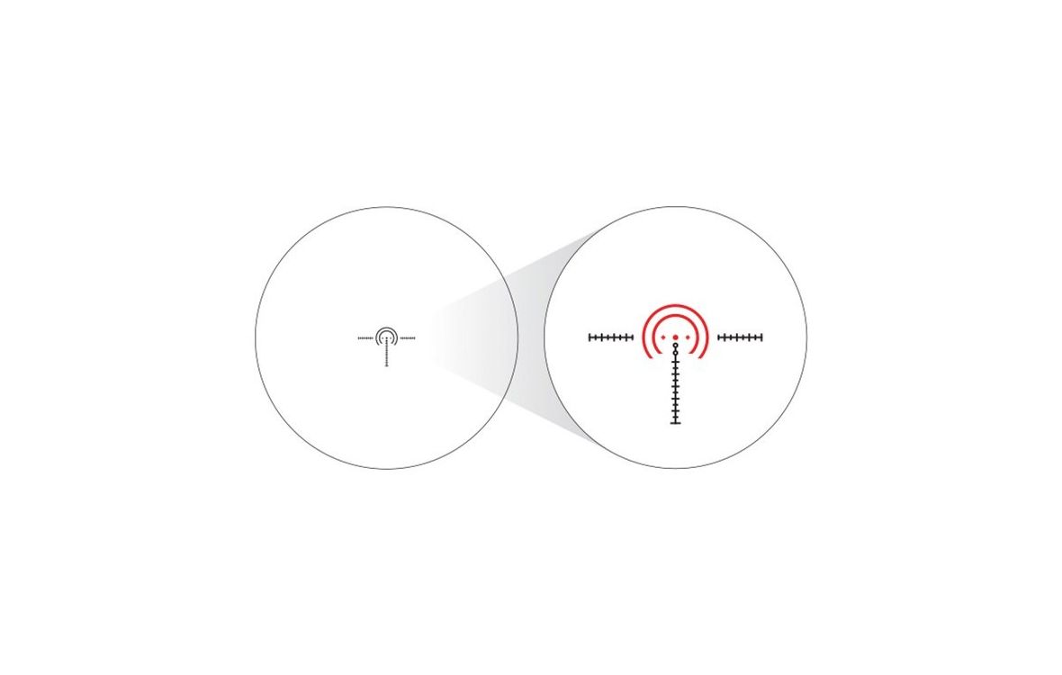 Тактико-спортивная сетка. Марка Speedforce вытравлена на стекле во 2-й фокальной плоскости (SFP), откалибрована на 4x и сохраняет видимые размеры при любой кратности. Сетка обеспечивает быстрый «захват» цели для стрельбы накоротке и одновременно — точную стрельбу выносом по удалённым объектам, подходит для оценки расстояния до цели, а также для ввода поправок на дальность, скорость объекта и боковой ветер. Разметка сделана с учётом требований ассоциаций IPSC и IPDA по спортивной стрельбе, настроена с учётом баллистики патрона .223 Rem (55 г) с начальной скоростью пули 990 м/с. Диаметр центральной точки 2 MOA, толщина прицельных линий 1 MOA, диаметр дуги 17 MOA.