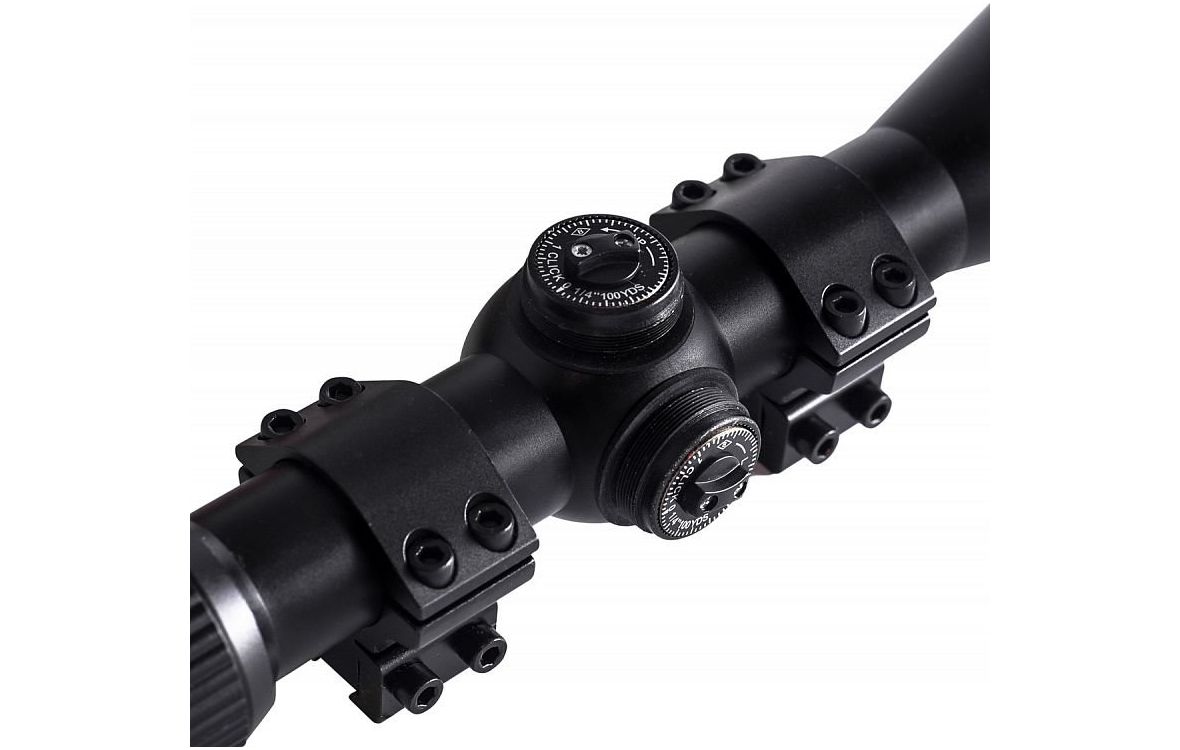 Крепление. В комплекте идет пара колец диаметром 25,4 мм с основанием на планку «ласточкин хвост» 3/8” (кольца уже установлены на прицел). Упор отдачи и 4-х винтовое крепление верхних полуколец обеспечивают дополнительную жёсткость, прочность и устойчивость.