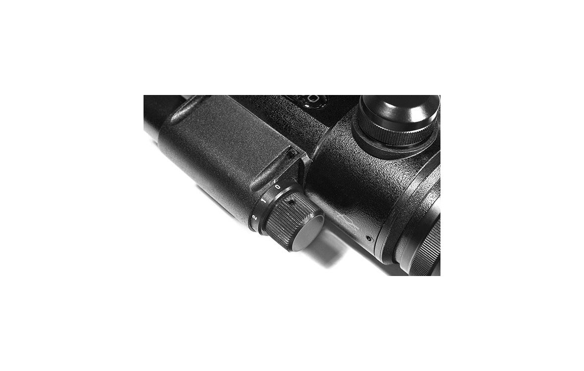 - Откидывающаяся крышка объектива со поворотной диафрагмой (O отверстий — от 0,5 до 5 мм) для включения / работы прицела днём или в ранних сумерках