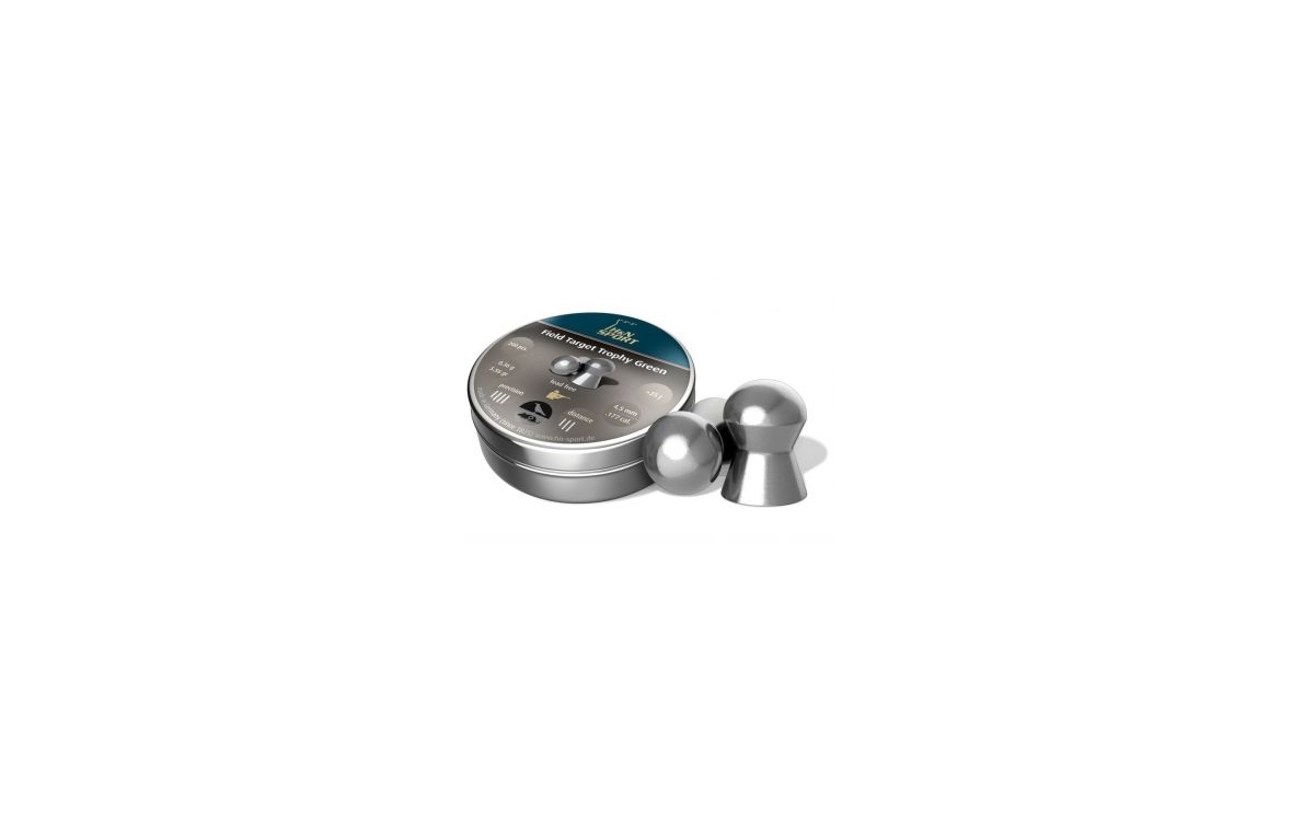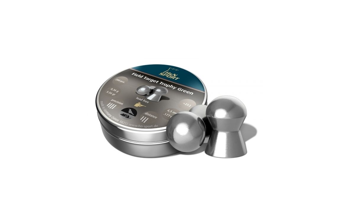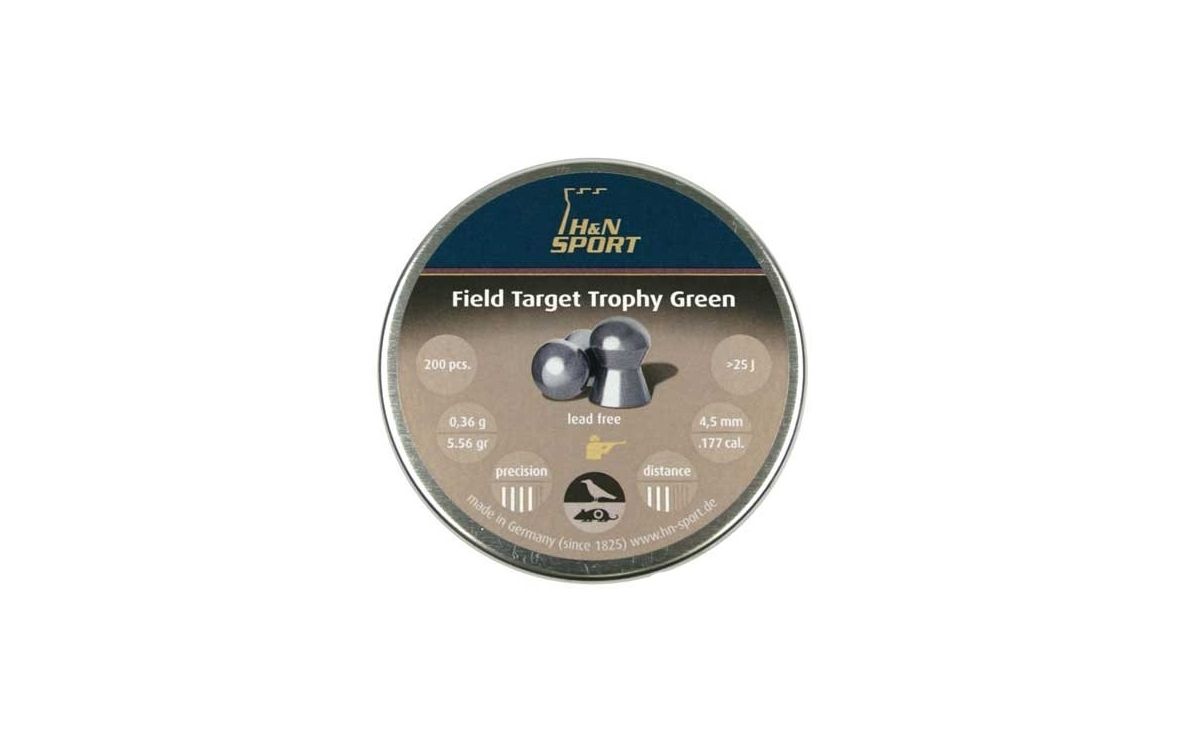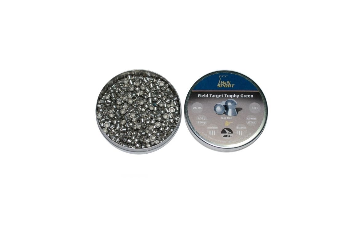 Пуля пневм. H&N Field Target Trophy Green .177" 4,5 mm (вес 0,36 гр) Бессвинцовая, легкая сверхскоростная пуля, чрезвычайная точность для соревнований и охоты. Сверхзвуковая скорость и очень настильная траектория полета для средних дистанций. Ствол не освинцовывается, улучшенное прохождение по каналу ствола, отсутствие контакта со свинцом благодаря специальному оловянному сплаву. Высокая пробиваемость, высокая кучность. Поверхность гладкая.