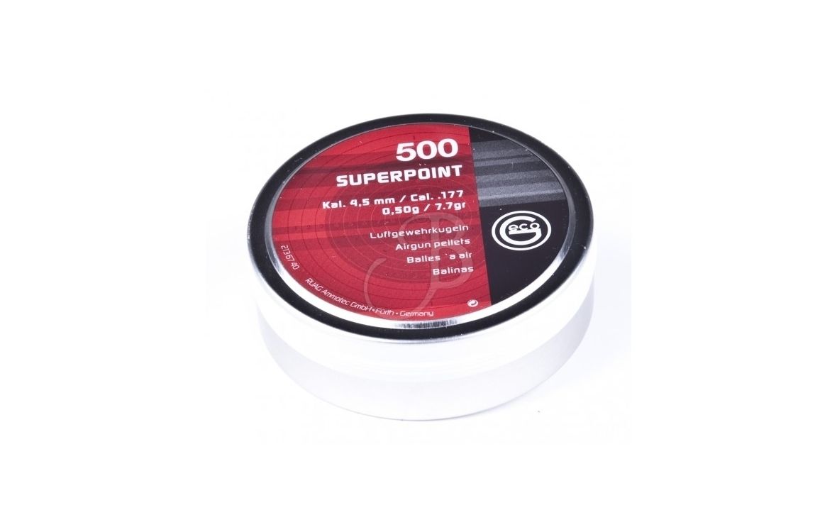 Свинцовые пневматические пули RWS Geco Super Point калибра 4,5 мм массой 0,50 грамм (7,7 гран). Это пуля средней массы для стрельбы из пневматической винтовки. Имеет конусообразную головную часть, что обеспечивает высокую пробиваемость и проникающую способность. Данная пневматическая пуля снискала большую популярность среди охотников. Оптимальное распределение массы пули RWS Geco Super Point способствует высокой точности попадания.