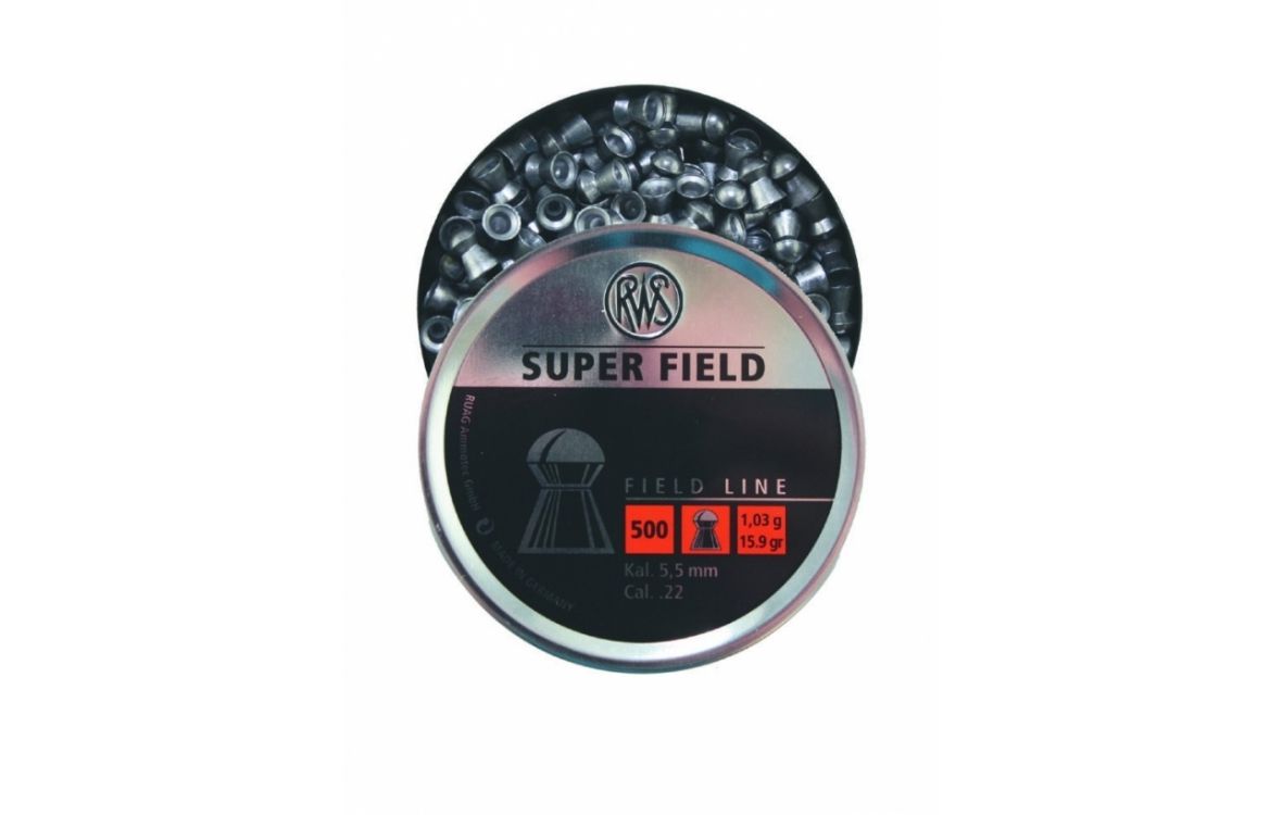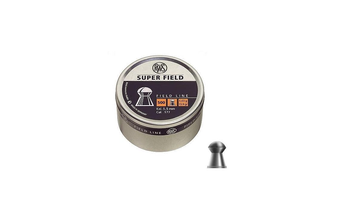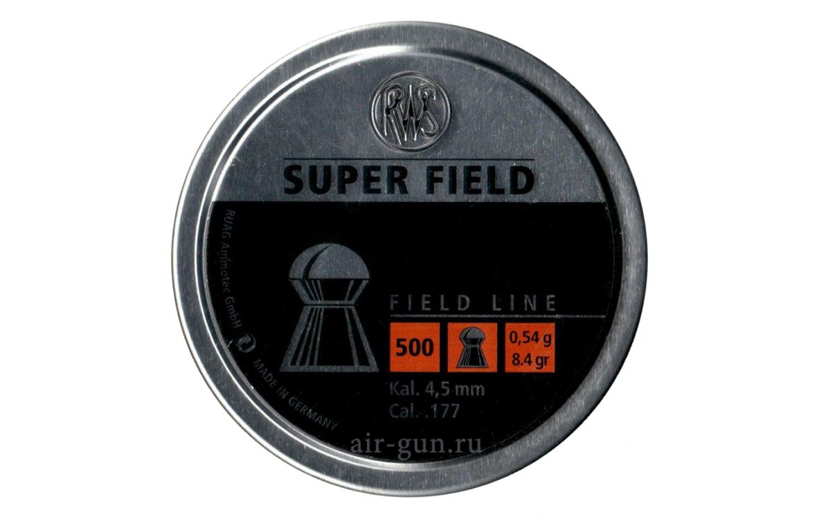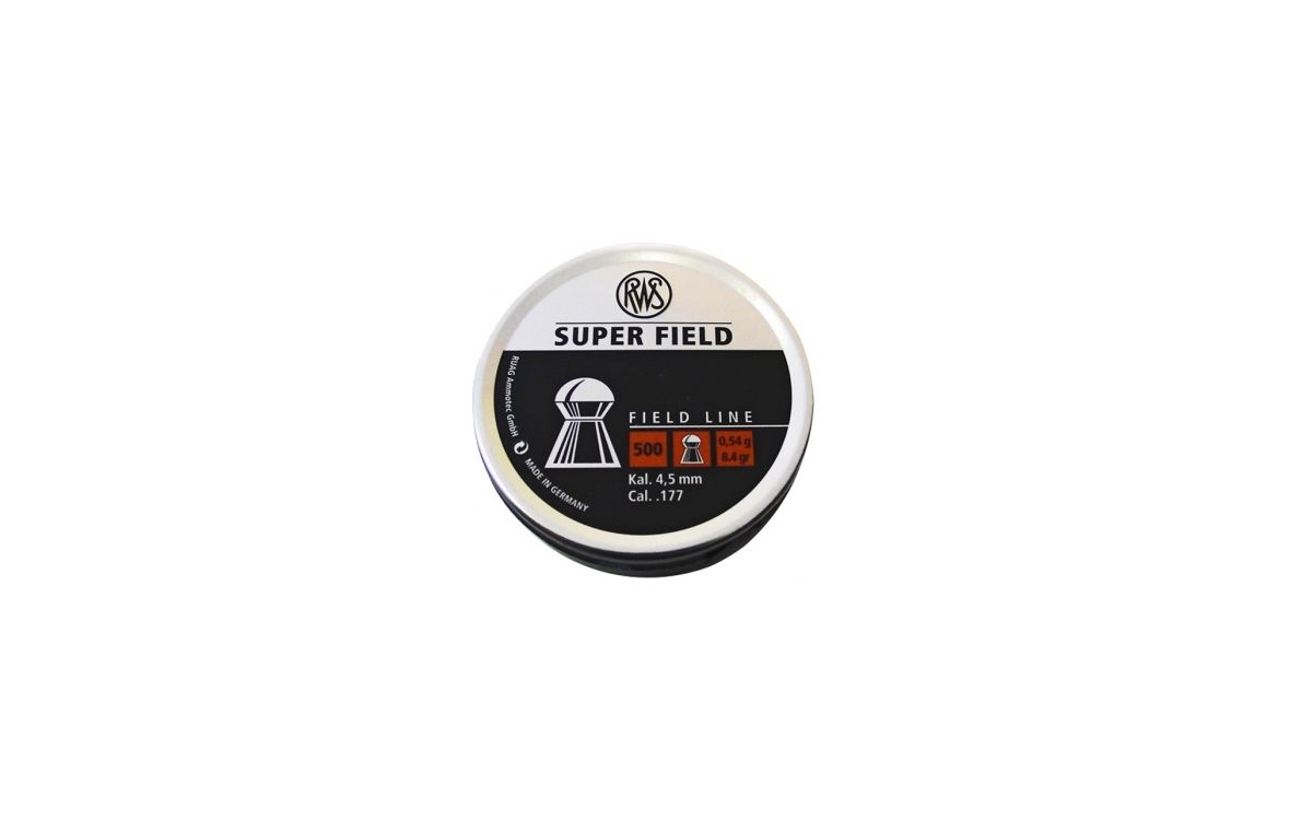 Пули свинцовые пневматические RWS Superfield калибра 4,5 мм весом 0,54 грамма. Является среднетяжёлой пулей с закругленной головной частью и может применяться для стрельбы из пружинно-поршневых винтовок с пневматическим цилиндром. Данную пулю RWS Superfield отличает большая мощность, точность, пробиваемость и высокая проникающая способность. Это лучший вариант пневматического боеприпаса для стрельбы по мишеням в полевых условиях (Field Target), а также во время охоты с пневматической винтовкой.