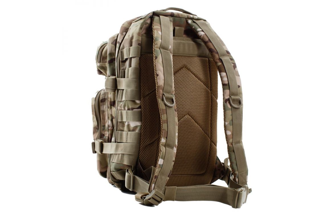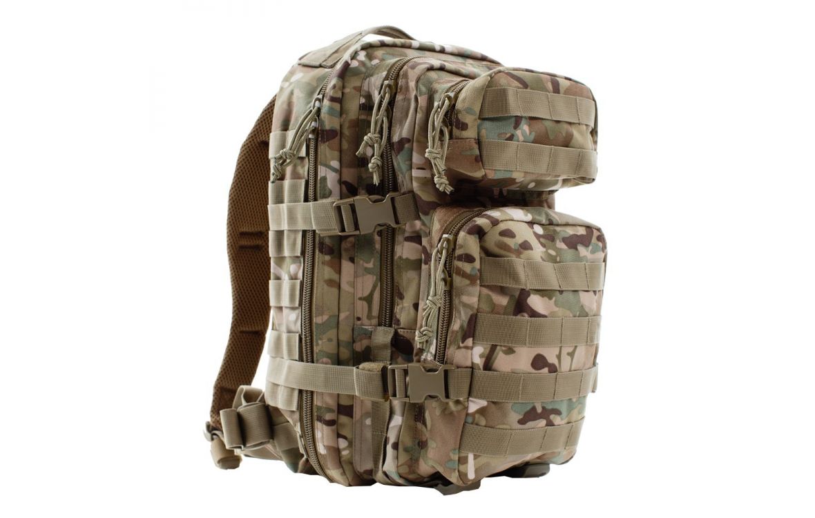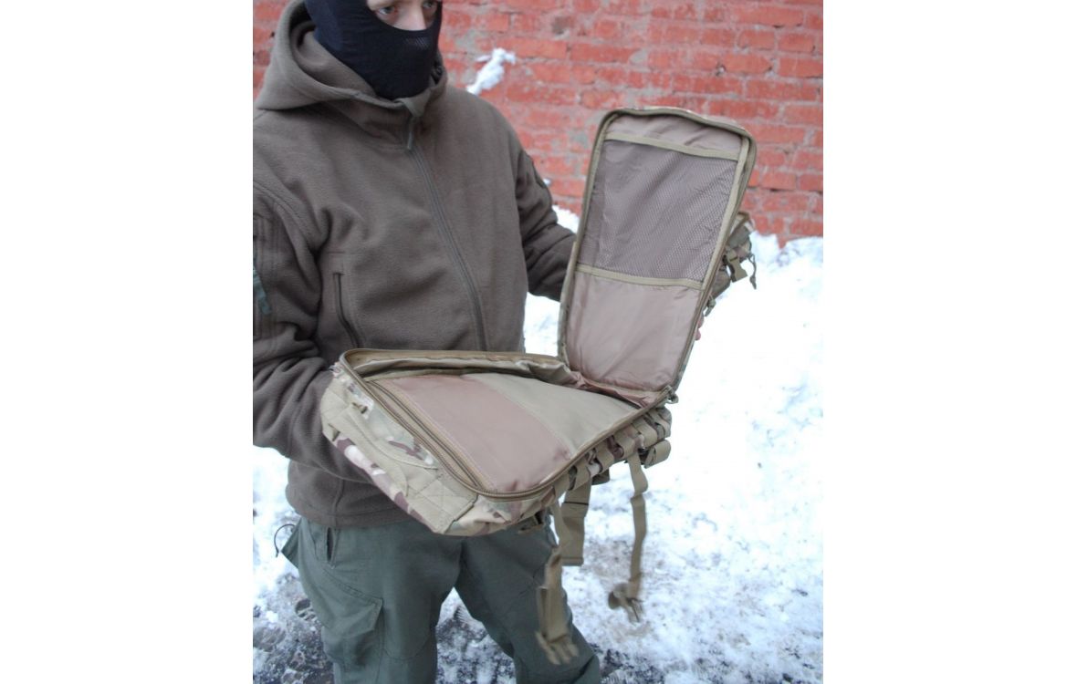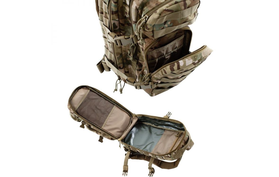 Универсальная система крепления подсумков MOLLE позволяет опционально навешивать дополнительные подсумки на рюкзак в соответствии с необходимостью. Точки наибольшего напряжения швов имеют двойную прошивку. Высококачественные молнии и фурнитура. Оптимальное расположение карманов и отделений, позволяющее иметь быстрый доступ к оборудованию и вещам. Удобная загрузка. Может использоваться совместно с питьевой системой.